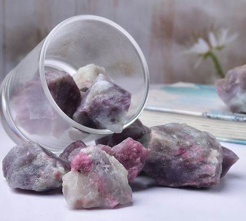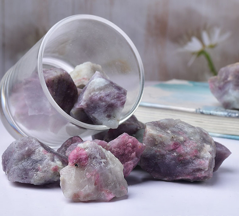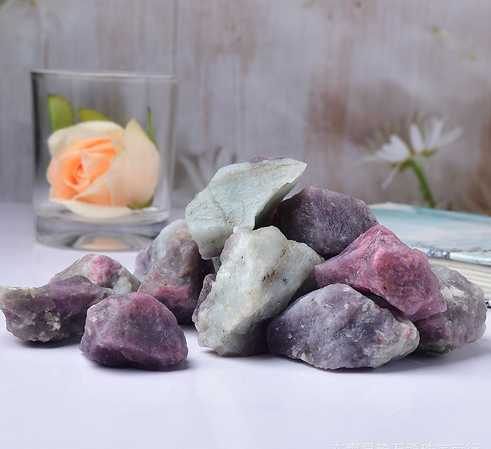 To maintain the beauty and energy of your Lepidolite chunks, avoid prolonged exposure to water, harsh chemicals, or extreme temperatures. Gently cleanse the stones with a soft cloth. You can recharge the stones by placing them in moonlight. Store the stones in a safe place when not in use.